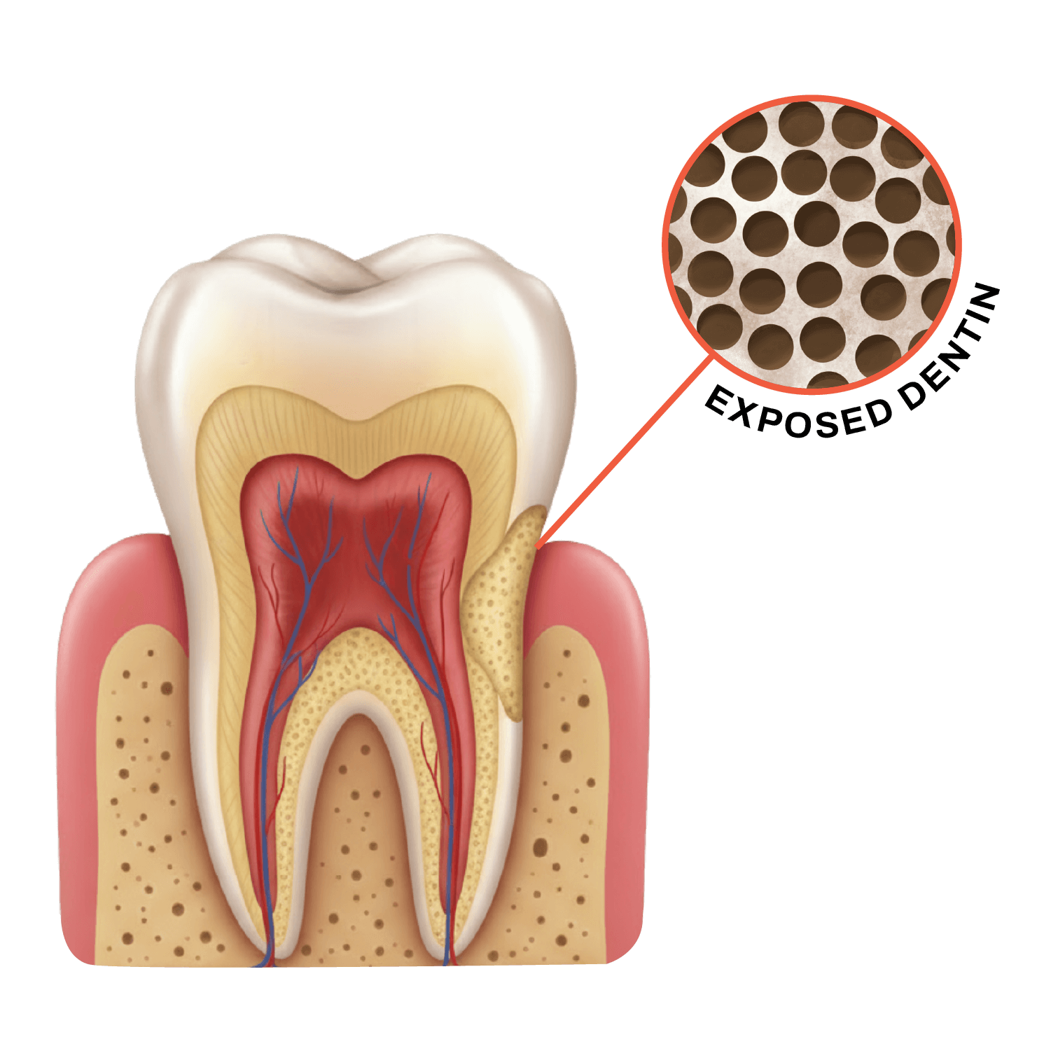 - Gum Recession: Often due to ageing or periodontal disease, it exposes dentin at the tooth root.
