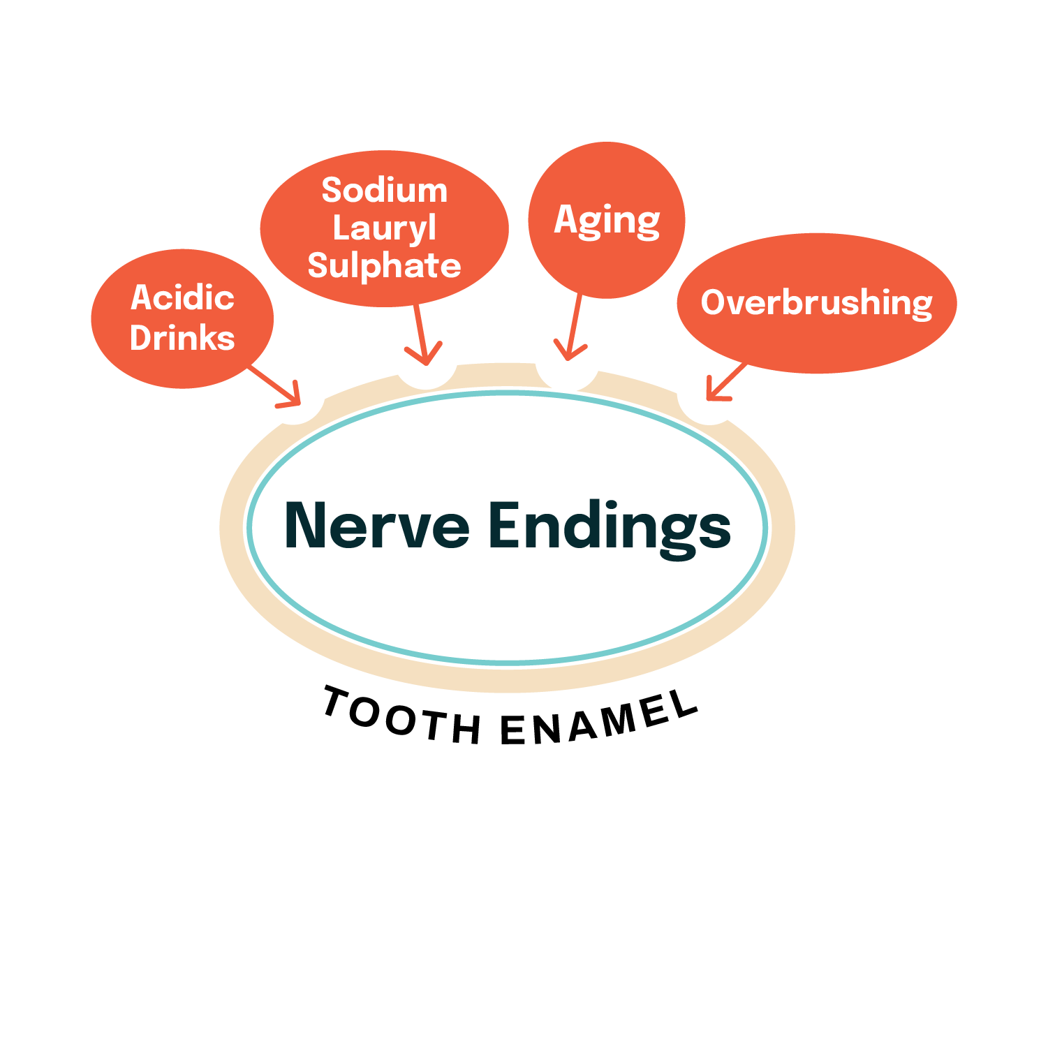 Enamel protects dentin, but when it thins, external stimuli can reach nerve endings. Dentin contains tubules, tiny channels that transmit sensations to the pulp. Acidic diets, aggressive brushing, and SLS-based products increase permeability, allowing pain signals to reach nerves faster.