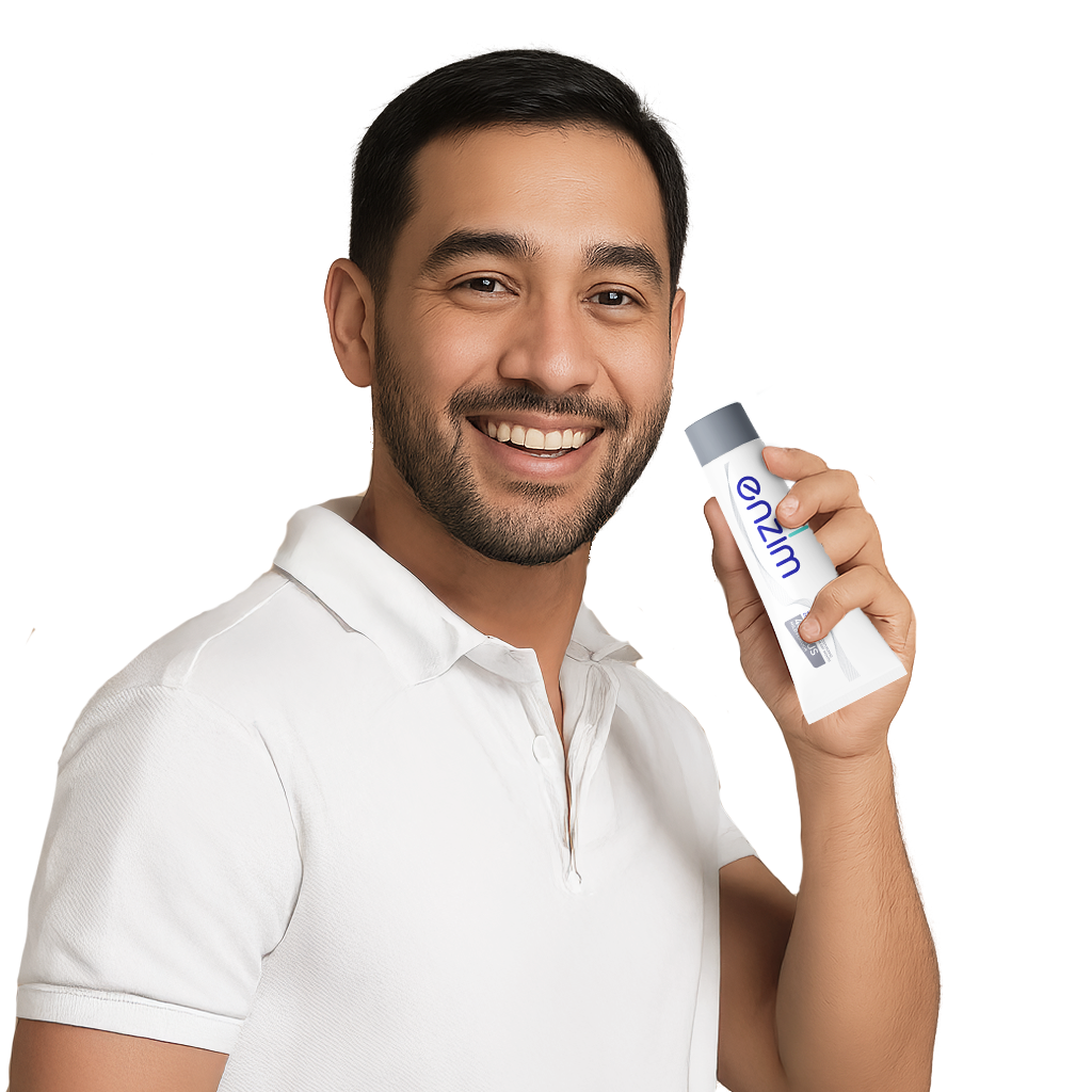 Enzim 40 Plus use enzyme and mild abrasives to clean gently, without SLS or irritation. Our enzyme system maintains a healthy microbiome while strengthening the natural barrier around dentin.